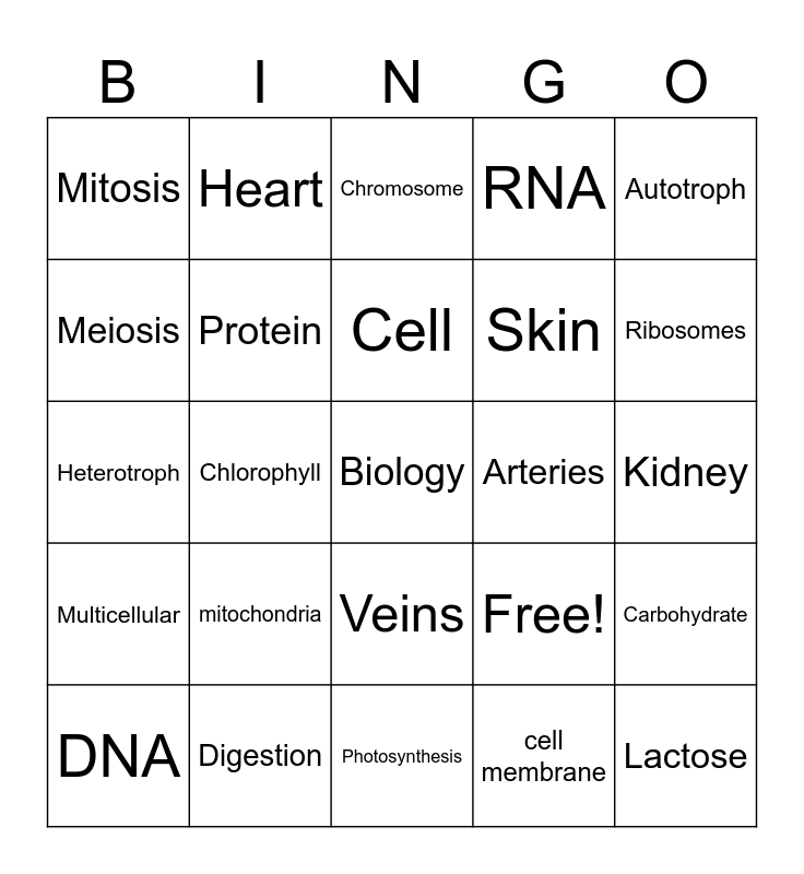 This bingo card has 25 words: mitochondria, Photosynthesis, Cell, DNA, Autotroph, Mitosis, Meiosis, Heart, Arteries, Veins, Skin, Heterotroph, Free!, Carbohydrate, Protein, Lactose, Kidney, Chromosome, Ribosomes, Chlorophyll, Biology, Digestion, Multicellular, RNA and cell membrane.
