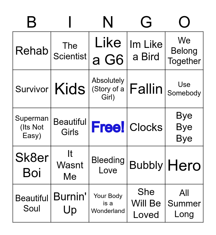 This bingo card has a free space and 79 words: You Belong With Me, Get the Party Started, Like a G6, Beautiful Day, Havent Met You Yet, Pieces of Me, Pompeii, Bad Romance, Irreplaceable, Apologize, Everywhere, Complicated, Im Like a Bird, Rehab, Waiting on the World to Change, Survivor, Photograph, It Wasnt Me, Drops of Jupiter, Bye Bye Bye, In Da Club, We Belong Together, Superman (Its Not Easy), Absolutely (Story of a Girl), Kids, Unwell, Crank That (Soulja Boy), Yeah!, In The End, Since You Been Gone, Use Somebody, Secrets, Your Body is a Wonderland, Lose Yourself, Beautiful Soul, Clocks, I Need To Know, Chariot, Pocketful of Sunshine, All Summer Long, Toxic, Underneath It All, Hot In Here, Fall For You, Dont Cha, The Scientist, Best I Ever Had, One More Time, How to Save a Life, Hips Dont Lie, Hero, Beautiful Girls, Bubbly, Rock Your Body, Beverly Hills, Love in This Club, Crazy In Love, Over My Head (Cable Car), Halo, Bleeding Love, Fallin, Firework, Drops of Jupiter, No Air, Pon de Replay, Hot N Cold, Crush, Love Song, 1,2 Step, Sk8er Boi, Burnin' Up, Kryptonite, Here Without You, Say My Name, So Sick, She Will Be Loved, Promiscuous, Feel Good Inc. and Unwritten.