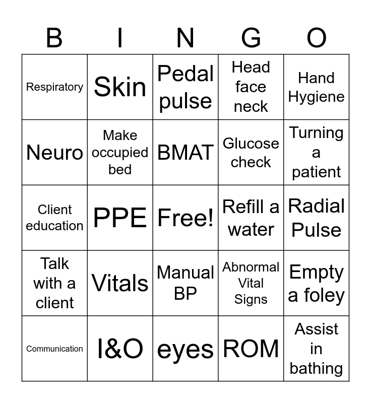 This bingo card has a free space and 24 words: Vitals, I&O, BMAT, Communication, Hand Hygiene, Respiratory, Neuro, Skin, Refill a water, Manual BP, Glucose check, Client education, Abnormal Vital Signs, Empty a foley, Make occupied bed, ROM, Radial Pulse, Pedal pulse, Turning a patient, PPE, Assist in bathing, Talk with a client, Head face neck and eyes.