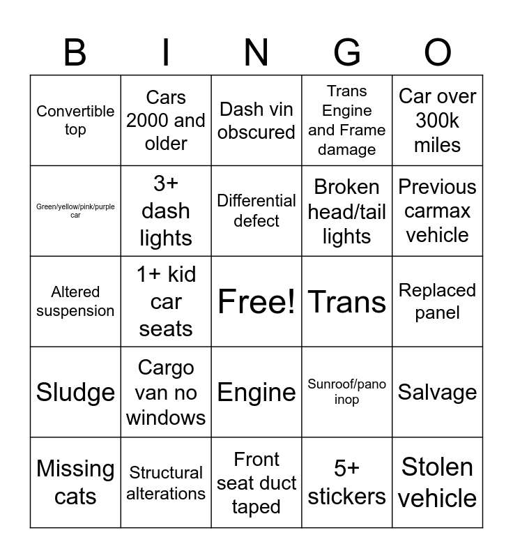 This bingo card has a free space and 44 words: 2026 or newer vehicle, Stolen vehicle, Convertible top inop/torn, Missing cats, Any smoke odor, 5+ stickers, Dash vin obscured, Replaceable damage to windshield, Car over 300k miles, Structural alterations, Trans Engine and Frame damage, Trans, Engine, Cargo van no windows, Box truck, Front seat duct taped, Dogleg damage, Altered suspension, 2026 models, Previous carmax vehicle, Cars 2000 and older, Canadian vehicle, Object around mirror, Convertible top, Non runner, Replaced panel, Aftermarket wheels, 22 inch or larger wheels, Sunroof/pano inop, Sludge, Stolen vehicle, Salvage, Rewelded panel, Legit rollback, 1+ kid car seats, Wrapped vehicle, After market exhaust, NMVTIS rebuilt, Differential defect, Green/yellow/pink/purple car, Broken head/tail lights, Ladder or bike rack, 3+ dash lights and 10+ engine codes.