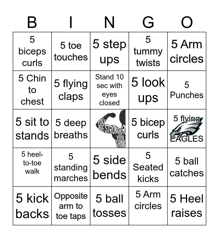 This bingo card has 1 images, a free space and 24 words: 5 standing marches, Opposite arm to toe taps, Stand 10 sec with eyes closed, 5 kick backs, 5 Arm circles, 5 biceps curls, 5 Chin to chest, 5 toe touches, 5 bicep curls, 5 side bends, 5 look ups, 5 sit to stands, 5 Seated kicks, 5 ball catches, 5 flying claps, 5 Arm circles, 5 flying EAGLES, 5 step ups, 5 Punches, 5 deep breaths, 5 Heel raises, 5 heel-to-toe walk, 5 tummy twists and 5 ball tosses.