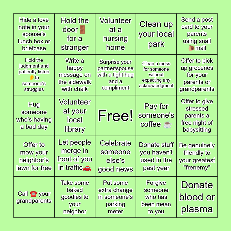 This bingo card has a free space and 24 words: Let people merge in front of you in traffic🚗, Take some baked goodies to your neighbor, Surprise your partner/spouse with a tight hug and a compliment, Call ☎️ your grandparents, Send a post card to your parents using snail 🐌mail, Hide a love note in your spouse's lunch box or briefcase, Hold the judgment and patiently listen 👂to someone's struggles, Hold the door🚪 for a stranger, Pay for someone's coffee ☕, Celebrate someone else's good news, Clean a mess for someone without expecting any acknowledgment, Hug someone who's having a bad day, Donate stuff you haven't used in the past year, Be genuinely friendly to your greatest "frenemy", Write a happy message on the sidewalk with chalk, Forgive someone who has been mean to you, Offer to give stressed parents a free night of babysitting, Volunteer at a nursing home, Offer to pick up groceries for your parents or grandparents, Volunteer at your local library, Donate blood or plasma, Offer to mow your neighbor's lawn for free, Clean up your local park and Put some extra change in someone's parking meter.