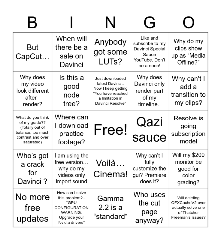 This bingo card has a free space and 24 words: I am using the free version… why do my videos only import sound, How can I solve this problem?.. “GPU CONFIGURATION WARNING. Upgrade your Nvidia drivers”, Just downloaded latest Davinci.. Now I keep getting “You have reached a limitation in Davinci Resolve”, No more free updates, Why do my clips show up as “Media Offline?”, But CapCut…, Why does my video look different after I render?, When will there be a sale on Davinci, Qazi sauce, Voilà… Cinema!, Why does Davinci only render part of my timeline.., What do you think of my grade?? (Totally out of balance, too much contrast and over saturated), Why can’t I fully customize the gui? Premiere does it?, Will my $200 monitor be good for color grading?, Is this a good node tree?, Who uses the cut page anyway?, Resolve is going subscription model, Anybody got some LUTs?, Why can’t I add a transition to my clips?, Where can I download practice footage?, Will deleting OFXCacheV2 ever actually solve one of Thatcher Freeman’s issues?, Who’s got a crack for Davinci ?, Like and subscribe to my Davinci Special Sauce YouTube. Don’t be a noob! and Gamma 2.2 is a “standard“.