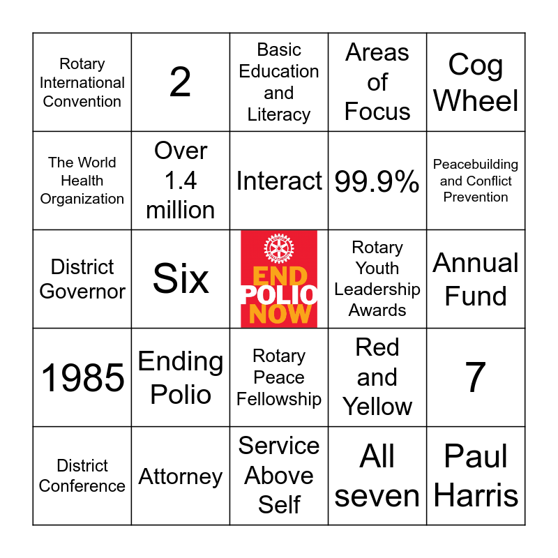 This bingo card has a free space and 50 words: 1905, Paul Harris, Chicago, Service Above Self, Ending Polio, End Polio Now, 2, Afghanistan and Pakistan, The World Health Organization, Global Grants, Over 1.4 million, Areas of Focus, 7, Red and Yellow, Rotary Magazine, Rotaract, Interact, Rotary Youth Leadership Awards, Evanston, Illinois, Cog Wheel, Six, All seven, Rotary International Convention, 99.9%, Franklin D. Roosevelt, Disease Prevention and Treatment, Peacebuilding and Conflict Prevention, Youth Exchange, Basic Education and Literacy, Rotary Peace Fellowship, Supporting the Environment, Club President, RI President, July 1, Attorney, Gates Foundation, Nonprofit, Fireside Chat, The Rotary Foundation, Annual Fund, Water, Sanitation and Hygiene, Maternal and Child Health, Membership, An online Rotary club, District Conference, District Governor, Invocation and Pledge, Club visits/events, 1985 and Bill & Melinda Gates Foundation.