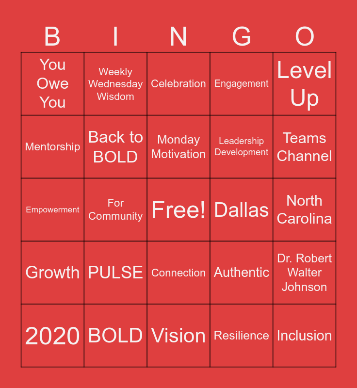 This bingo card has a free space and 24 words: PULSE, BOLD, Monday Motivation, 2020, Level Up, You Owe You, Mentorship, Weekly Wednesday Wisdom, Dallas, Connection, Leadership Development, Empowerment, Authentic, Dr. Robert Walter Johnson, Back to BOLD, Resilience, North Carolina, Celebration, Teams Channel, For Community, Inclusion, Growth, Engagement and Vision.