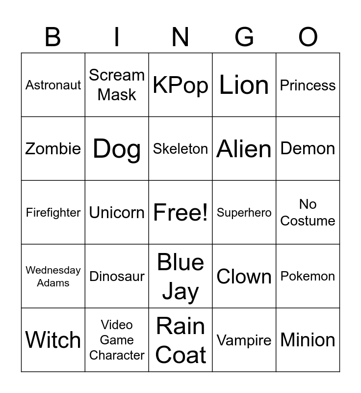 This bingo card has a free space and 24 words: Dinosaur, Video Game Character, Skeleton, Witch, Princess, Astronaut, Zombie, Scream Mask, Superhero, Blue Jay, Alien, Firefighter, Clown, Pokemon, Dog, Vampire, No Costume, KPop, Demon, Unicorn, Minion, Wednesday Adams, Lion and Rain Coat.