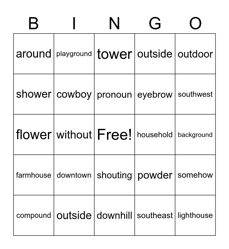 This bingo card has a free space and 24 words: downtown, outside, pronoun, compound, outdoor, around, shower, playground, household, shouting, eyebrow, flower, powder, somehow, cowboy, southeast, background, tower, southwest, without, lighthouse, farmhouse, outside and downhill.