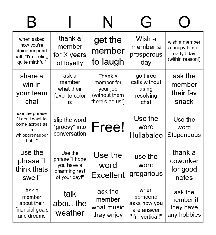 This bingo card has a free space and 33 words: Use the word cattywompus, Use the phrase "have a brilliant rest of your day!", slip the word "groovy" into conversation, Do a PFP, use the phrase "I think thats swell", ask a member what their favorite color is, wish a member a happy late or early bday (within reason!), Ask a member about their financial goals and dreams, thank a member for X years of loyalty, ask a member how they are enjoying the city they are living in, Thank a member for your job (without them there's no us!), get the member to laugh, use the phrase "remember seattle CU is here for you", Use the phrase "sorry I'm a little discombobulated", Use the word Hullabaloo, ask the member their fav snack, talk about the weather, use the phrase "I don't want to come across as a whippersnapper but...", Use the phrase "I hope you have a charming rest of your day!", use the word gregarious, Use the word Excellent, Use the word Fortuitous, when asked how you're doing respond with "I'm feeling quite mirthful", Use the word Stupendous, ask the member what music they enjoy, ask the member if they have any hobbies, Wish a member a prosperous day, go three calls without using resolving chat, share a win in your team chat, thank a coworker for good notes, take a moment to be present and thankful, when someone asks how you are answer "I'm vertical!" and use an onomatopoeia.