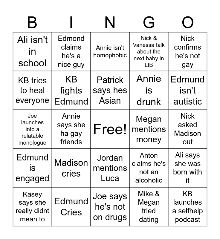 This bingo card has a free space and 24 words: Madison cries, Edmund Cries, Patrick says hes Asian, Kasey says she really didnt mean to, Nick confirms he's not gay, Ali isn't in school, KB tries to heal everyone, Edmond claims he's a nice guy, Megan mentions money, Jordan mentions Luca, Annie is drunk, Joe launches into a relatable monologue, Anton claims he's not an alcoholic, Ali says she was born with it, KB fights Edmund, Mike & Megan tried dating, Nick asked Madison out, Annie isn't homophobic, Edmund isn't autistic, Annie says she ha gay friends, KB launches a selfhelp podcast, Edmund is engaged, Nick & Vanessa talk about the next baby in LIB and Joe says he's not on drugs.