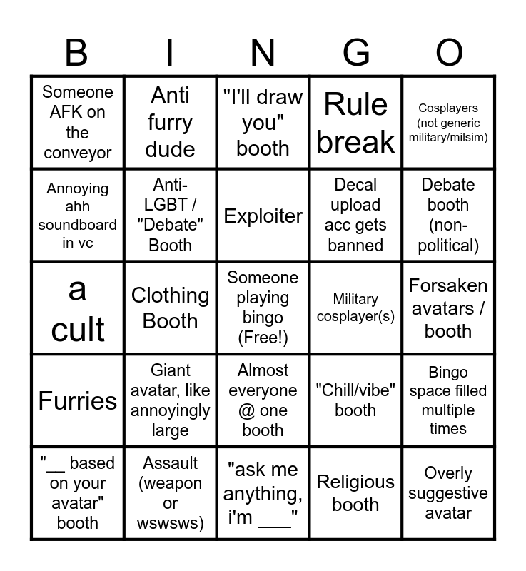 This bingo card has a free space and 32 words: Religious booth, Blahaj, Clothing Booth, Zoo / "Selling people" / Pets booth, Furries, Anti-LGBT / "Debate" Booth, Cosplayers (not generic military/milsim), Bingo space filled multiple times, Anti furry dude, Brainrot, Exploiter, "I'll draw you" booth, Prison Booth, Ragebait, Military cosplayer(s), Game/contest booth, "__ based on your avatar" booth, a cult, Almost everyone @ one booth, Giant avatar, like annoyingly large, "Chill/vibe" booth, Pointless poll, Forsaken avatars / booth, Assault (weapon or wswsws), Overly suggestive avatar, Rule break, Decal upload acc gets banned, Annoying ahh soundboard in vc, Someone AFK on the conveyor, "ask me anything, i'm ___", Booths referencing each other and Debate booth (non-political).