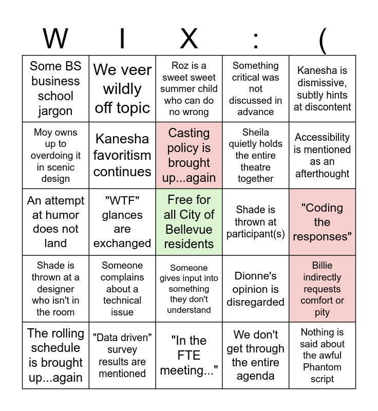 This bingo card has a free space and 24 words: Someone complains about a technical issue, "Data driven" survey results are mentioned, Casting policy is brought up...again, The rolling schedule is brought up...again, Kanesha is dismissive, subtly hints at discontent, Some BS business school jargon, Moy owns up to overdoing it in scenic design, We veer wildly off topic, Shade is thrown at participant(s), Someone gives input into something they don't understand, Sheila quietly holds the entire theatre together, An attempt at humor does not land, Dionne's opinion is disregarded, Billie indirectly requests comfort or pity, Kanesha favoritism continues, We don't get through the entire agenda, "Coding the responses", Roz is a sweet sweet summer child who can do no wrong, Accessibility is mentioned as an afterthought, "WTF" glances are exchanged, Nothing is said about the awful Phantom script, Shade is thrown at a designer who isn't in the room, Something critical was not discussed in advance and "In the FTE meeting...".