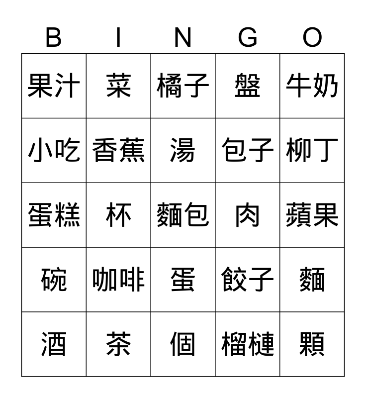 This bingo card has a free space and 24 words: 咖啡, 茶, 湯, 酒, 牛奶, 果汁, 小吃, 菜, 肉, 蛋, 包子, 蛋糕, 餃子, 麵, 香蕉, 榴槤, 蘋果, 橘子, 柳丁, 杯, 顆, 碗, 盤 and 個.