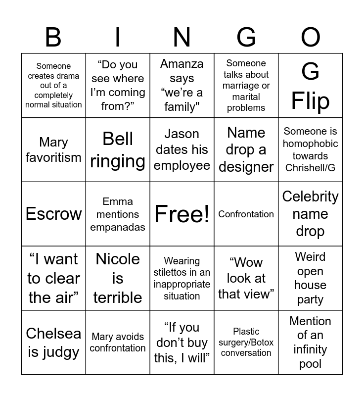 This bingo card has a free space and 27 words: “Wow look at that view”, Bre mentions Nick Cannon, Name drop a designer, “If you don’t buy this, I will”, Mary favoritism, Amanza says “we’re a family", “Do you see where I’m coming from?”, “I want to clear the air”, Confrontation, Weird open house party, Escrow, Someone talks about marriage or marital problems, Chelsea is judgy, Mary avoids confrontation, Someone is homophobic towards Chrishell/G, Someone closes a deal, Bell ringing, Jason dates his employee, Nicole is terrible, Someone creates drama out of a completely normal situation, Celebrity name drop, Plastic surgery/Botox conversation, Emma mentions empanadas, Mention of an infinity pool, Wearing stilettos in an inappropriate situation, G Flip and Inappropriate outfit at showing.