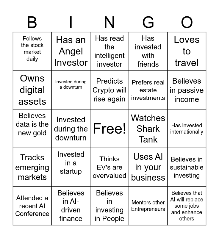 This bingo card has a free space and 24 words: Invested in a startup, Believes in AI-driven finance, Predicts Crypto will rise again, Attended a recent AI Conference, Loves to travel, Follows the stock market daily, Owns digital assets, Has an Angel Investor, Watches Shark Tank, Thinks EV's are overvalued, Prefers real estate investments, Believes data is the new gold, Uses AI in your business, Believes in sustainable investing, Invested during a downturn, Mentors other Entrepreneurs, Has invested internationally, Has read the intelligent investor, Believes in passive income, Invested during the downturn, Believes that AI will replace some jobs and enhance others, Tracks emerging markets, Has invested with friends and Believes in investing in People.