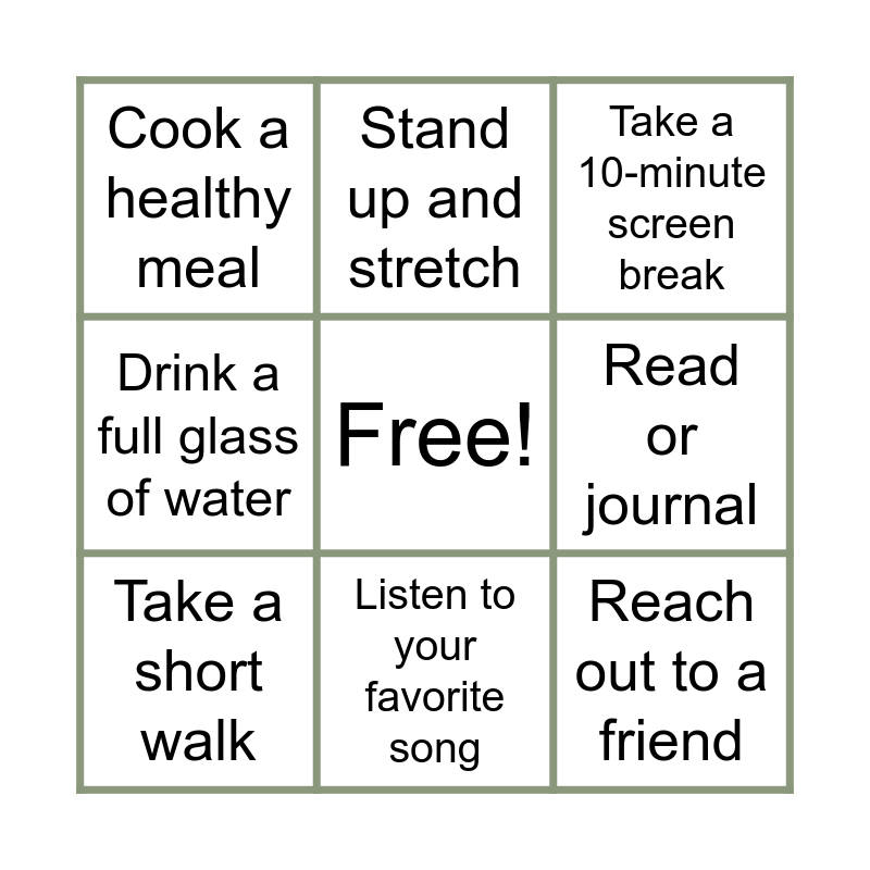 This bingo card has a free space and 8 words: Read or journal, Take a 10-minute screen break, Stand up and stretch, Take a short walk, Cook a healthy meal, Reach out to a friend, Drink a full glass of water and Listen to your favorite song.