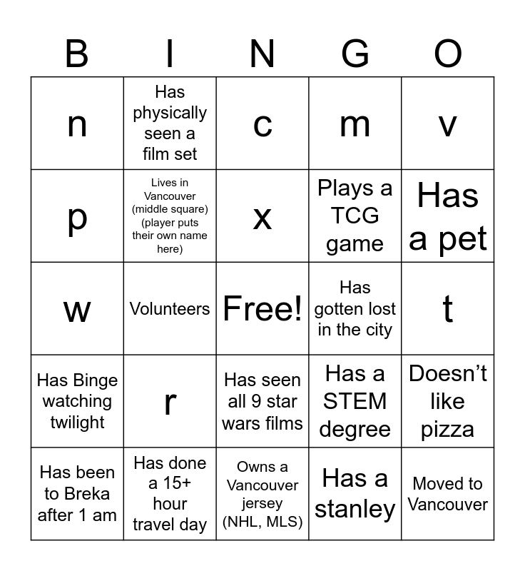 This bingo card has a free space and 79 words: a, b, c, d, e, f, g, h, i, j, k, l, m, n, o, p, q, r, s, t, u, v, w, x, Lives in Vancouver (middle square) (player puts their own name here), Skied at all three local mountains, Owns a boat, Travelled to more than 5 countries, Speaks two or more languages, Born in your birth month, Has a pet, Met a local celebrity, Owns a Vancouver jersey (NHL, MLS), Can do a headstand, Has been to Breka after 1 am, Has gotten lost in the city, Takes public transit as main transportation, Lives in an apartment building, Lives in a house, Moved to Vancouver, Has either L an N or no license, Has put on an event before, Is an artist, Works in a different city than where they live, Is currently in school, Has physically seen a film set, Has multiple passports, Went to elementary school in BC, Has ran a marathon, Has more than two siblings, Doesn’t like pizza, Volunteers, Has a STEM degree, Has a Red Seal, Has seen a concert in Rogers, Went to UBC, Has seen and read all of Harry Potter, Has walked the whole seawall, Has polar swim, Has seen all 9 star wars films, Plays a TCG game, Plays Chess, Has a tattoo, Has been skydiving, Has performed on stage in front of an audience, Lactose intolerant (approved by our lactose intolerant person), Is Vegan, Has done the grouse grind, complains about the rain more then it rains, Has Binge watching twilight, Has done a 15+ hour travel day, Attended fright night, Visited Bowen Island, Has stayed in a Vancouver hotel, Can Recommend five coffee shops, Has a stanley, Has climbed outside, Has attended a whitecaps game and Attended Vancouver pride parade.