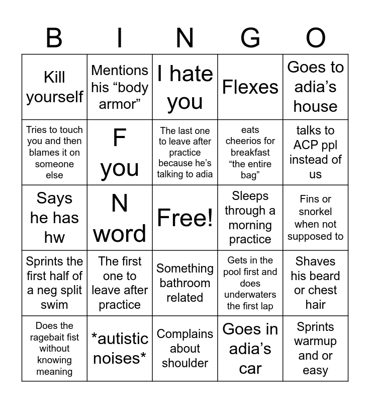 This bingo card has a free space and 30 words: *autistic noises*, Anything w stab, N word, Sybau, Kill yourself, I hate you, F you, Something bathroom related, Sleeps through a morning practice, Complains about shoulder, Fins or snorkel when not supposed to, Sprints warmup and or easy, Goes in adia’s car, Getting out early for “school”, talks to ACP ppl instead of us, “i was just doing my underwaters”, Gets in the pool first and does underwaters the first lap, Sprints the first half of a neg split swim, The first one to leave after practice, Goes to adia’s house, Says he has hw, Leaves early off the wall, Mentions his “body armor”, eats cheerios for breakfast “the entire bag”, Tries to touch you and then blames it on someone else, Flexes, Shaves his beard or chest hair, Does the ragebait fist without knowing meaning, The last one to leave after practice because he’s talking to adia and pretends to goon.