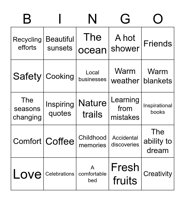 This bingo card has 101 words: Free!, Family, Friends, Health, A safe home, Food, Water, Sunshine, Laughter, Nature, Dogs, Cats, Good books, Music, Hobbies, Experiences, Comfort, Kindness of strangers, Lively conversations, Inspirational people, Learning new things, Good memories, Technology, Artistic expression, Traveling, Warm blankets, A hot shower, Coffee, Tea, Fresh air, Beautiful sunsets, The ocean, Mountains, Supportive friends, Moments of peace, Childhood memories, Achievements, Family traditions, Fresh fruits, A comfortable bed, Local community, Love, Generosity, Kind gestures, Strong relationships, Nature trails, Exercise, Clean environments, Good health care, Creativity, Opportunities, Safety, Empathy, Lively debates, Sense of humor, Pets, Kindred spirits, Handwritten letters, Memories with loved ones, Smiles from strangers, Cooking, Gardening, New beginnings, Forgiveness, Long walks, Warm weather, Soft pillows, Inspiring quotes, Celebrations, Achievements of others, Nature's beauty, Good sleep, Recycling efforts, Acts of kindness, Local businesses, The seasons changing, Family reunions, Laughing until it hurts, Quiet moments, Cultural experiences, Festivals and events, Earth’s resources, Learning from mistakes, Afternoon naps, Healing moments, Support networks, Inspirational books, Life lessons, Memories of vacations, Positive changes, Accidental discoveries, Learning new skills, Acts of love, The kindness of nature, Beautiful art, The ability to dream, Small victories, Acts of bravery, Quality time, Peaceful mornings and The gift of today.