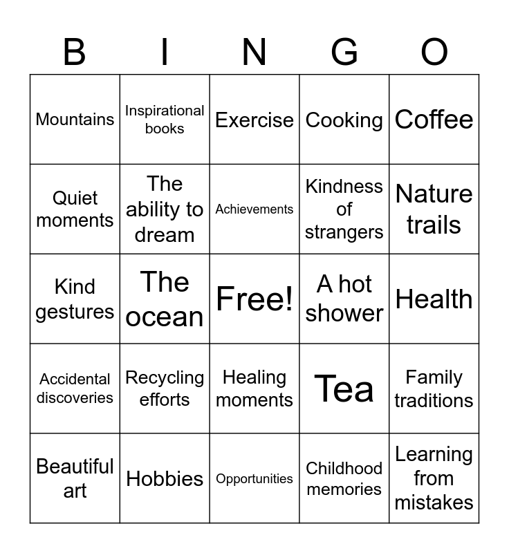 This bingo card has a free space and 100 words: Family, Friends, Health, A safe home, Food, Water, Sunshine, Laughter, Nature, Dogs, Cats, Good books, Music, Hobbies, Experiences, Comfort, Kindness of strangers, Lively conversations, Inspirational people, Learning new things, Good memories, Technology, Artistic expression, Traveling, Warm blankets, A hot shower, Coffee, Tea, Fresh air, Beautiful sunsets, The ocean, Mountains, Supportive friends, Moments of peace, Childhood memories, Achievements, Family traditions, Fresh fruits, A comfortable bed, Local community, Love, Generosity, Kind gestures, Strong relationships, Nature trails, Exercise, Clean environments, Good health care, Creativity, Opportunities, Safety, Empathy, Lively debates, Sense of humor, Pets, Kindred spirits, Handwritten letters, Memories with loved ones, Smiles from strangers, Cooking, Gardening, New beginnings, Forgiveness, Long walks, Warm weather, Soft pillows, Inspiring quotes, Celebrations, Achievements of others, Nature's beauty, Good sleep, Recycling efforts, Acts of kindness, Local businesses, The seasons changing, Family reunions, Laughing until it hurts, Quiet moments, Cultural experiences, Festivals and events, Earth’s resources, Learning from mistakes, Afternoon naps, Healing moments, Support networks, Inspirational books, Life lessons, Memories of vacations, Positive changes, Accidental discoveries, Learning new skills, Acts of love, The kindness of nature, Beautiful art, The ability to dream, Small victories, Acts of bravery, Quality time, Peaceful mornings and The gift of today.