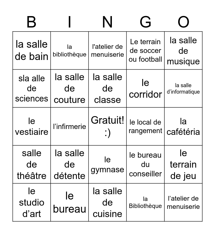 This bingo card has a free space and 26 words: le gymnase, la Bibliothèque, la salle de classe, le bureau, la salle de musique, la salle de bain, sla alle de sciences, la bibliothèque, la cafétéria, le bureau du conseiller, le corridor, le vestiaire, le terrain de jeu, le studio d’art, l’infirmerie, la cour de récréation, Le terrain de soccer ou football, salle de théâtre, l'atelier de menuiserie, l’atelier de menuiserie, la salle d’informatique, la salle de cuisine, le local de rangement, la salle de détente, la salle de couture and la salle de graphisme.