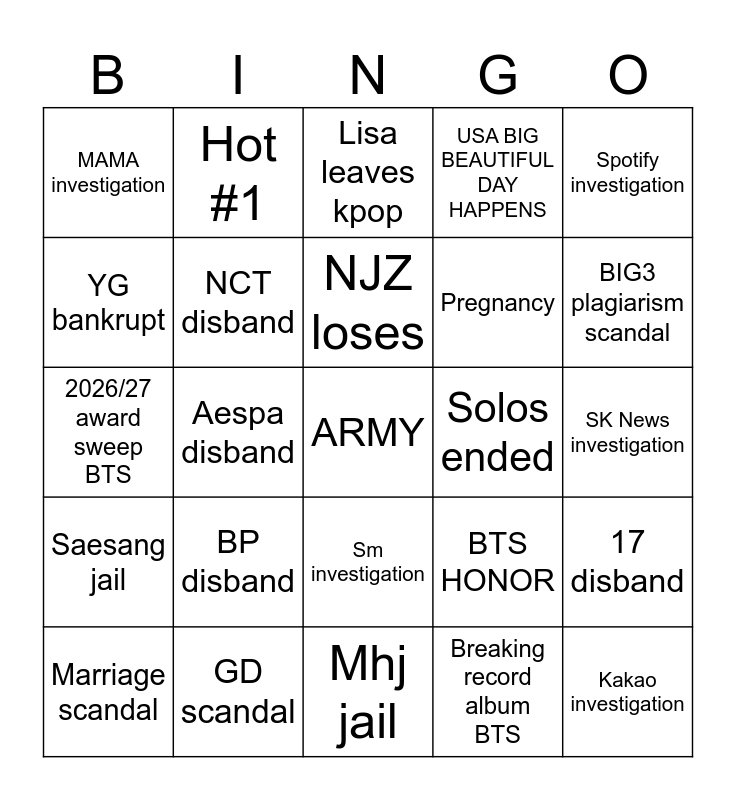 This bingo card has a free space and 24 words: BP disband, GD scandal, NJZ loses, Marriage scandal, Spotify investigation, MAMA investigation, YG bankrupt, Hot #1, Solos ended, Sm investigation, Pregnancy, 2026/27 award sweep BTS, BTS HONOR, 17 disband, NCT disband, Breaking record album BTS, SK News investigation, Lisa leaves kpop, BIG3 plagiarism scandal, Aespa disband, Kakao investigation, Saesang jail, USA BIG BEAUTIFUL DAY HAPPENS and Mhj jail.