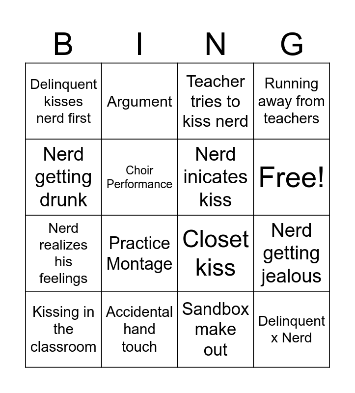 This bingo card has 18 words: Practice Montage, Delinquent x Nerd, Teacher tries to kiss nerd, Delinquent kisses nerd first, Closet kiss, Running away from teachers, Kissing in the classroom, Argument, Free!, Nerd realizes his feelings, Sandbox make out, Nerd getting drunk, Nerd getting jealous, Choir Performance, Nerd inicates kiss, Umbrella kiss, Accidental hand touch and Grabs neck to kiss.