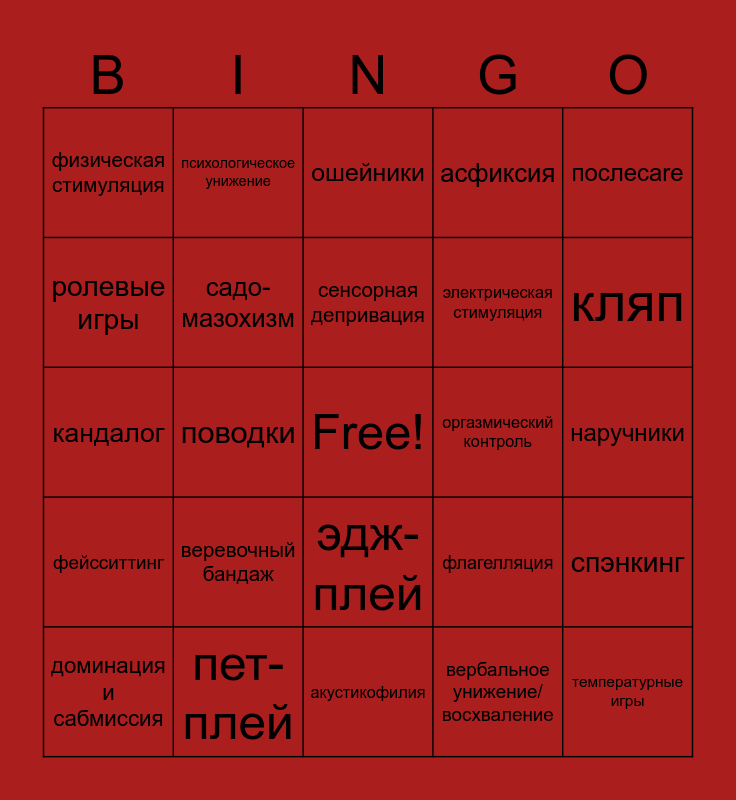 This bingo card has a free space and 24 words: веревочный бандаж, пет-плей, сенсорная депривация, доминация и сабмиссия, послеcare, физическая стимуляция, ролевые игры, психологическое унижение, оргазмический контроль, эдж-плей, электрическая стимуляция, кандалог, флагелляция, спэнкинг, садо-мазохизм, вербальное унижение/восхваление, наручники, ошейники, кляп, поводки, температурные игры, фейсситтинг, асфиксия and акустикофилия.