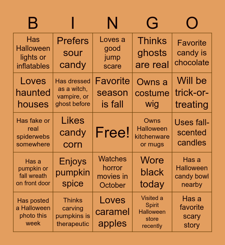 This bingo card has a free space and 24 words: Enjoys pumpkin spice, Thinks carving pumpkins is therapeutic, Favorite season is fall, Has posted a Halloween photo this week, Favorite candy is chocolate, Has Halloween lights or inflatables, Loves haunted houses, Prefers sour candy, Owns Halloween kitchenware or mugs, Watches horror movies in October, Owns a costume wig, Has fake or real spiderwebs somewhere, Wore black today, Has a Halloween candy bowl nearby, Has dressed as a witch, vampire, or ghost before, Visited a Spirit Halloween store recently, Uses fall-scented candles, Loves a good jump scare, Will be trick-or-treating, Likes candy corn, Has a favorite scary story, Has a pumpkin or fall wreath on front door, Thinks ghosts are real and Loves caramel apples.