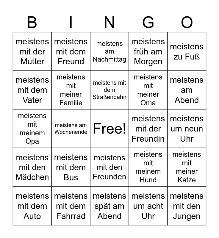 This bingo card has a free space and 24 words: meistens mit dem Bus, meistens mit dem Fahrrad, meistens mit dem Straßenbahn, meistens mit dem Auto, meistens zu Fuß, meistens mit der Mutter, meistens mit dem Vater, meistens mit dem Freund, meistens mit der Freundin, meistens mit den Freunden, meistens mit meiner Oma, meistens mit meinem Opa, meistens mit meinem Hund, meistens mit meiner Katze, meistens mit meiner Familie, meistens um acht Uhr, meistens um neun Uhr, meistens am Nachmittag, meistens am Abend, meistens am Wochenende, meistens mit den Jungen, meistens mit den Mädchen, meistens früh am Morgen and meistens spät am Abend.