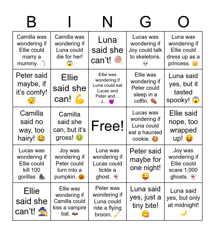 This bingo card has a free space and 34 words: Joy was wondering if Luna could eat jack-oβ-lanterns! π, Luna said yes, just a tiny bite! π, Peter was wondering if Lucas could eat a Halloween costume. π», Lucas said no way! π, Lucas was wondering if Ellie could kill 100 gorillas. π¦, Ellie said she can! πͺ, Luna was wondering if Ellie could dress up as a princess. π, Ellie said she canβt! π§ββοΈ, Camilla was wondering if Luna could die for her! π±, Luna said she canβt! π, Ellie was wondering if Luna could eat Lucas and Peter andβ¦ Jβ¦ π, Luna said she canβt! π, Peter was wondering if Joy could dance with a zombie! π§ββοΈ, Joy said she can, but only if itβs polite! π, Lucas was wondering if Luna could eat a haunted cookie. πͺ, Luna said yes, but it tasted spooky! π±, Ellie was wondering if Camilla could kiss a vampire bat. π¦, Camilla said no way, too hairy! π, Joy was wondering if Peter could turn into a pumpkin. π, Peter said maybe for one night! π, Luna was wondering if Lucas could tickle a ghost. π», Lucas said yes, but the ghost disappeared! π, Camilla was wondering if Ellie could marry a mummy. π§», Ellie said nope, too wrapped up! π, Peter was wondering if Luna could ride a flying broom. π§Ή, Luna said yes, but only at midnight! π, Lucas was wondering if Joy could talk to skeletons. π, Joy said yes, theyβre very chatty! π, Ellie was wondering if Peter could sleep in a coffin. β°οΈ, Peter said maybe, if itβs comfy! π΄, Luna was wondering if Camilla could juggle eyeballs. ποΈ, Camilla said she can, but itβs gross! π€’, Joy was wondering if Ellie could scare 1,000 ghosts. π» and Ellie said she can, and they ran away screaming! π.