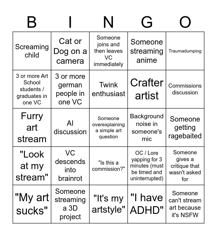 This bingo card has 73 words: Free!, "Are you an artist?", Screaming child, Political discussion, NSFW discussion, "The industry", "Look at my stream", Streaming a video game, OC / Lore yapping for 3 minutes (must be timed and uninterrupted), "Where is vc-text?", Someone can't stream art because it's NSFW, "Where are you from?", 3 or more german people in one VC, Someone getting ragebaited, Sexist comment, Cat or Dog on a camera, "It's my artstyle", 3 or more Art School students / graduates in one VC, Someone's microphone glitching, Background noise in someone's mic, Twink enthusiast, Someone streaming anime, Traumadumping, "I'm proud of this art", "My art sucks", 3 or more PRO artists in one VC (must have the PRO tag), Someone gets kicked or banned from a VC, Guessing a country from someone's accent, "That is crazy", Anime discussion, Someone streaming a 3D project, Drunk or high person on a VC, at least 2 deafened people in one VC, at least 4 muted people in one VC, AI discussion, Art industry discussion, Someone painting on a phone, 2 V-Tuber avatars in one VC, Someone overexplaining a simple art question, "I have autism", "I have ADHD", VC descends into brainrot, "OMG your art is so cool!", Drama discussion, Traditional artist showing their work, Crafter artist, Someone joins and then leaves VC immediately, Pixel art stream, Anime / Manga art stream, Furry art stream, Someone singing, "I'm locked in", Somebody using Photoshop, "Does anyone use Clip Studio Paint?", Someone asks for software help, Someone asks for art help, Someone asks for critique / opinion, "Is this a commission?", Someone works on a comic / manga, Hating on the mods, "Why is no one talking?", Crash out, Someone geeking out over their hyperfixation, Commissions discussion, Pricing question / advise, Someone sends me a friend request, 2 people on a camera, Someone talks in another language, Someone gives a critique that wasn't asked for, A locked channel, 2 full channels at the same time, someone burps over mic and someone eats over mic.