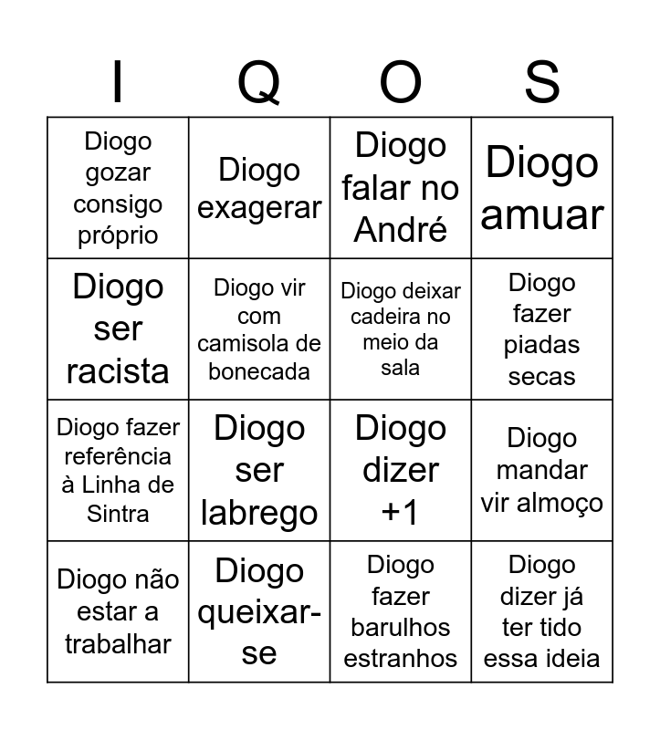 This bingo card has 16 words: Diogo queixar-se, Diogo mandar vir almoço, Diogo falar no André, Diogo gozar consigo próprio, Diogo fazer referência à Linha de Sintra, Diogo exagerar, Diogo dizer +1, Diogo fazer barulhos estranhos, Diogo ser racista, Diogo vir com camisola de bonecada, Diogo não estar a trabalhar, Diogo amuar, Diogo ser labrego, Diogo fazer piadas secas, Diogo deixar cadeira no meio da sala and Diogo dizer já ter tido essa ideia.