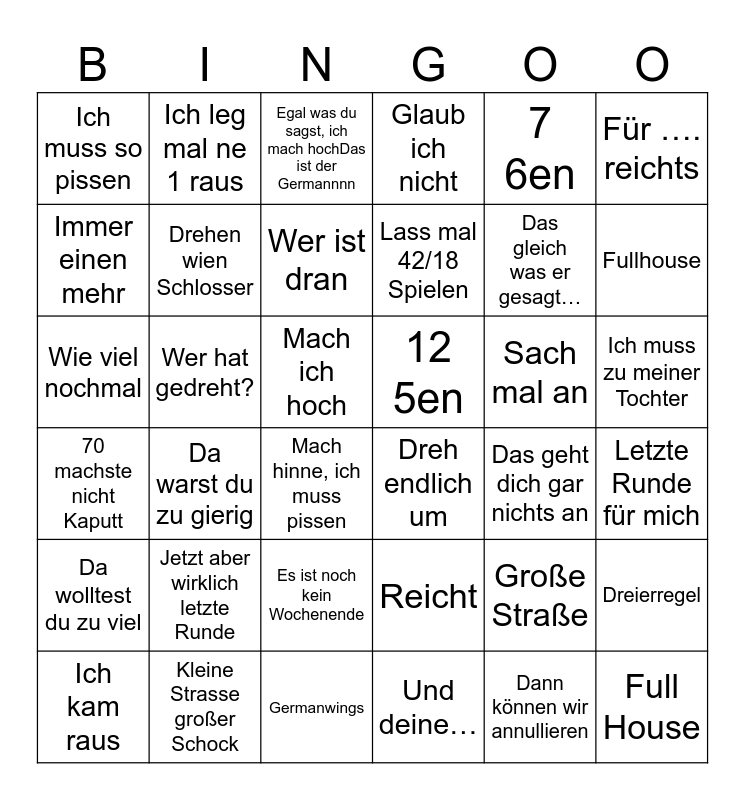 This bingo card has 41 words: Und deine…, Das gleich was er gesagt…, Ich hab nur vier Würfel, Immer einen mehr, Dreh endlich um, Ich muss zu meiner Tochter, Drehen wien Schlosser, 6 1en, 7 6en, 12 5en, Fullhouse, Glaub ich nicht, Wie viel nochmal, Mach ich hoch, Wer hat gedreht?, Sach mal an, Ich kam raus, Ich muss so pissen, Dann können wir annullieren, Egal was du sagst, ich mach hochDas ist der Germannnn, Da warst du zu gierig, Da wolltest du zu viel, Das geht dich gar nichts an, Wer ist dran, Full House, Große Straße, Letzte Runde für mich, Wer kommt denn raus?, Lass mal 42/18 Spielen, Jetzt aber wirklich letzte Runde, Gaußsche Normalverteilung, Ich leg mal ne 1 raus, Mach hinne, ich muss pissen, Kleine Strasse großer Schock, 70 machste nicht Kaputt, Für …. reichts, Es ist noch kein Wochenende, Dreierregel, Germanwings, Reicht and Das lass ich stehen.