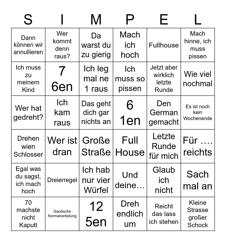 This bingo card has 36 words: Und deine…, Ich hab nur vier Würfel, Dreh endlich um, Ich muss zu meinem Kind, Drehen wien Schlosser, 6 1en, 7 6en, 12 5en, Fullhouse, Glaub ich nicht, Wie viel nochmal, Mach ich hoch, Sach mal an, Ich kam raus, Ich muss so pissen, Dann können wir annullieren, Egal was du sagst, ich mach hoch, Den German gemacht, Wer hat gedreht?, Da warst du zu gierig, Das geht dich gar nichts an, Wer ist dran, Full House, Große Straße, Letzte Runde für mich, Wer kommt denn raus?, Jetzt aber wirklich letzte Runde, Gaußsche Normalverteilung, Ich leg mal ne 1 raus, Mach hinne, ich muss pissen, Kleine Strasse großer Schock, 70 machste nicht Kaputt, Für …. reichts, Es ist noch kein Wochenende, Dreierregel and Reicht das lass ich stehen.