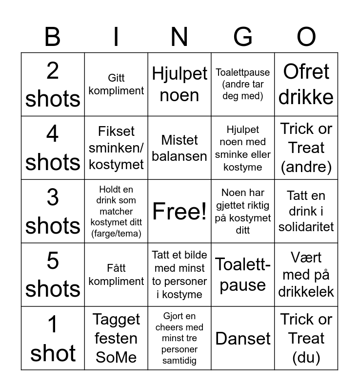 This bingo card has a free space and 24 words: 1 shot, Fått kompliment, Mistet balansen, Danset, Ofret drikke, 2 shots, Gitt kompliment, Hjulpet noen, Noen har gjettet riktig på kostymet ditt, Tatt en drink i solidaritet, 3 shots, Fikset sminken/ kostymet, Toalett- pause, Vært med på drikkelek, 4 shots, Tagget festen SoMe, Gjort en cheers med minst tre personer samtidig, Toalettpause (andre tar deg med), Trick or Treat (andre), 5 shots, Holdt en drink som matcher kostymet ditt (farge/tema), Tatt et bilde med minst to personer i kostyme, Hjulpet noen med sminke eller kostyme and Trick or Treat (du).