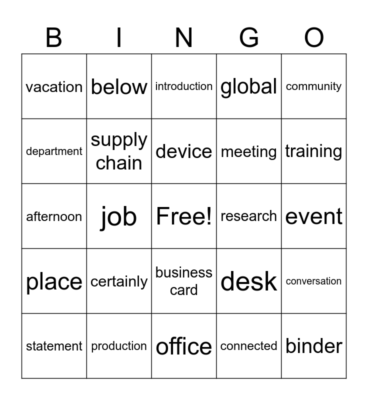 This bingo card has a free space and 24 words: certainly, production, device, statement, community, vacation, department, below, research, business card, meeting, afternoon, desk, conversation, supply chain, connected, event, introduction, training, job, binder, place, global and office.
