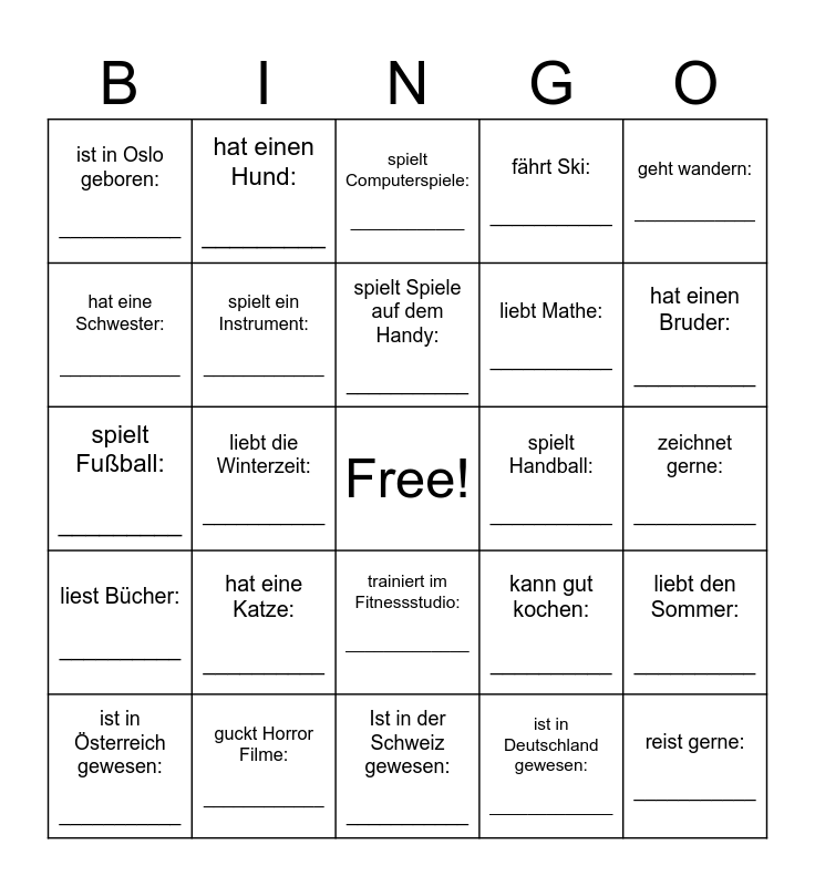 This bingo card has a free space and 24 words: hat eine Katze: __________, guckt Horror Filme: ____________, spielt Spiele auf dem Handy: ___________, ist in Österreich gewesen: ___________, geht wandern: ____________, ist in Oslo geboren: ___________, hat eine Schwester: ____________, hat einen Hund: _________, spielt Handball: ___________, trainiert im Fitnessstudio: _____________, liebt Mathe: ___________, spielt Fußball: _________, kann gut kochen: __________, liebt den Sommer: __________, spielt ein Instrument: ____________, ist in Deutschland gewesen: _____________, zeichnet gerne: ___________, spielt Computerspiele: ____________, hat einen Bruder: __________, liebt die Winterzeit: ___________, reist gerne: ___________, liest Bücher: __________, fährt Ski: ___________ and Ist in der Schweiz gewesen: ___________.