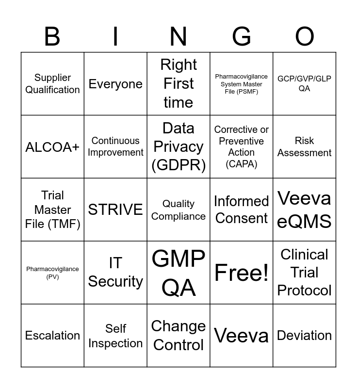 This bingo card has 27 words: Free!, Deviation, Corrective or Preventive Action (CAPA), Change Control, ALCOA+, Right First time, Everyone, Pharmacovigilance (PV), Informed Consent, Clinical Trial Protocol, Trial Master File (TMF), Pharmacovigilance System Master File (PSMF), Escalation, Self Inspection, Risk Assessment, Quality Culture, Continuous Improvement, Data Privacy (GDPR), IT Security, Supplier Qualification, Veeva eQMS, Veeva, STRIVE, Quality Compliance, GMP QA, GCP/GVP/GLP QA and Benchling.