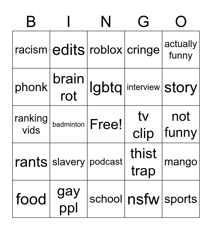 This bingo card has a free space and 24 words: slavery, gay ppl, lgbtq, food, actually funny, racism, phonk, edits, tv clip, podcast, interview, ranking vids, thist trap, mango, brain rot, nsfw, not funny, roblox, story, badminton, sports, rants, cringe and school.