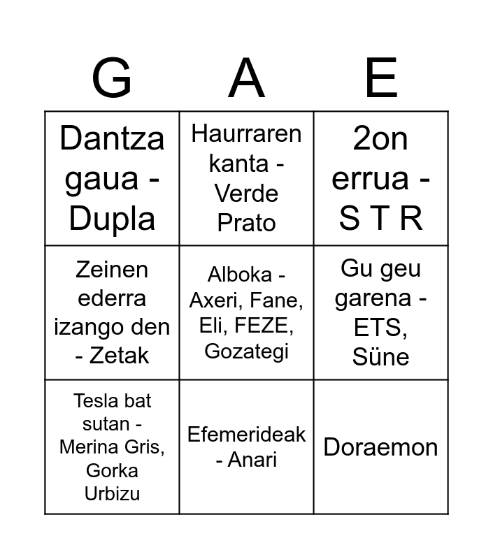 This bingo card has a free space and 25 words: Free!, Aldapan gora - Huntza, Efemerideak - Anari, Arratsalde honetan - Sorotan Bele, Doraemon, Dantza gaua - Dupla, Gu geu garena - ETS, Süne, Haurraren kanta - Verde Prato, Ilargi berriak - Neomak, Xorieri - Izaro, Baiuca, Bi begi, bi lore - Janus Lester, Nögen, Kolpe - Kai Nakai, Lau teilatu - Itoiz, sAIATZEN nAIZ - Merina Gris, Tesla bat sutan - Merina Gris, Gorka Urbizu, Morroxko - Mirua, Negua joan da ta - Zea Mays, 2on errua - S T R, Sarri sarri - Kortatu, Oroitzen - Sukena, Txanpon baten truke - Alaitz eta Maider, Txoria txori - Mikel Laboa, Xalbadorren heriotzean - Erramun Martikorena, Zeinen ederra izango den - Zetak and Zure begiak - La Txama, ENE.