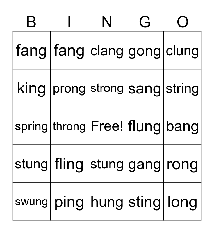 This bingo card has a free space and 24 words: fling, ping, strong, swung, clung, fang, king, fang, flung, stung, sang, spring, gang, rong, prong, sting, bang, clang, string, throng, long, stung, gong and hung.