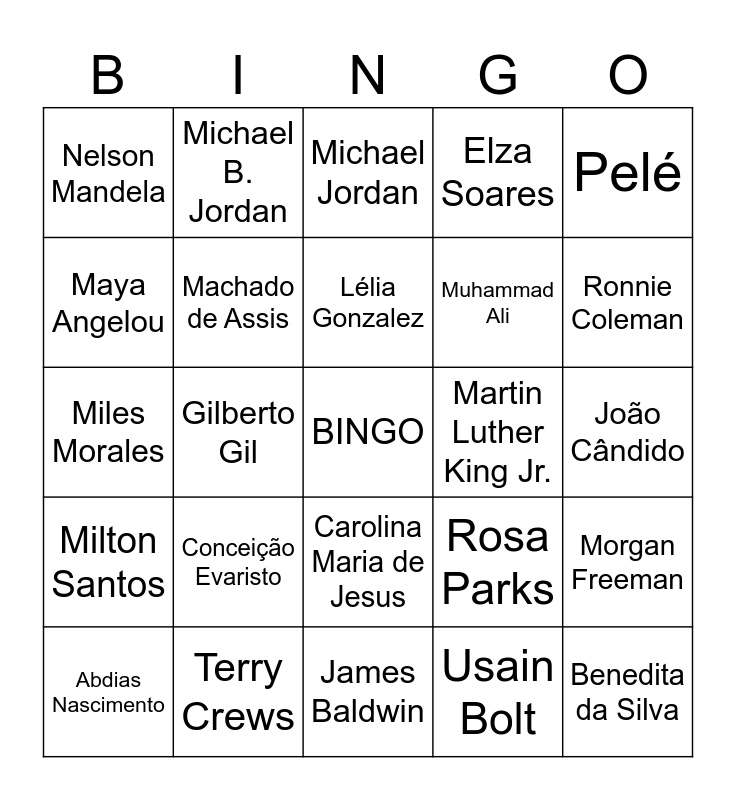 This bingo card has a free space and 39 words: Zumbi dos Palmares, Dandara dos Palmares, Luiz Gama, Machado de Assis, Abdias Nascimento, Carolina Maria de Jesus, Lélia Gonzalez, Marielle Franco, Pelé, Milton Santos, Gilberto Gil, Elza Soares, Benedita da Silva, João Cândido, Martin Luther King Jr., Conceição Evaristo, Malcolm X, Nelson Mandela, Angela Davis, Rosa Parks, Maya Angelou, James Baldwin, Muhammad Ali, Ronnie Coleman, Racionais MC’s, Jorge Ben Jor, 50 cent, Doctor D.R.E, Barack Obama, Michael B. Jordan, Lebron James, Will Smith, Michael Jordan, Terry Crews, Usain Bolt, Shaquille O'Neal, Morgan Freeman, Miles Morales and Super Choque.