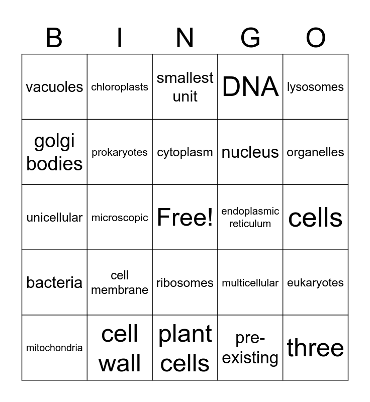 This bingo card has a free space and 24 words: cell membrane, cell wall, cytoplasm, mitochondria, lysosomes, vacuoles, golgi bodies, chloroplasts, endoplasmic reticulum, ribosomes, nucleus, unicellular, multicellular, eukaryotes, prokaryotes, pre-existing, cells, smallest unit, organelles, microscopic, three, bacteria, DNA and plant cells.