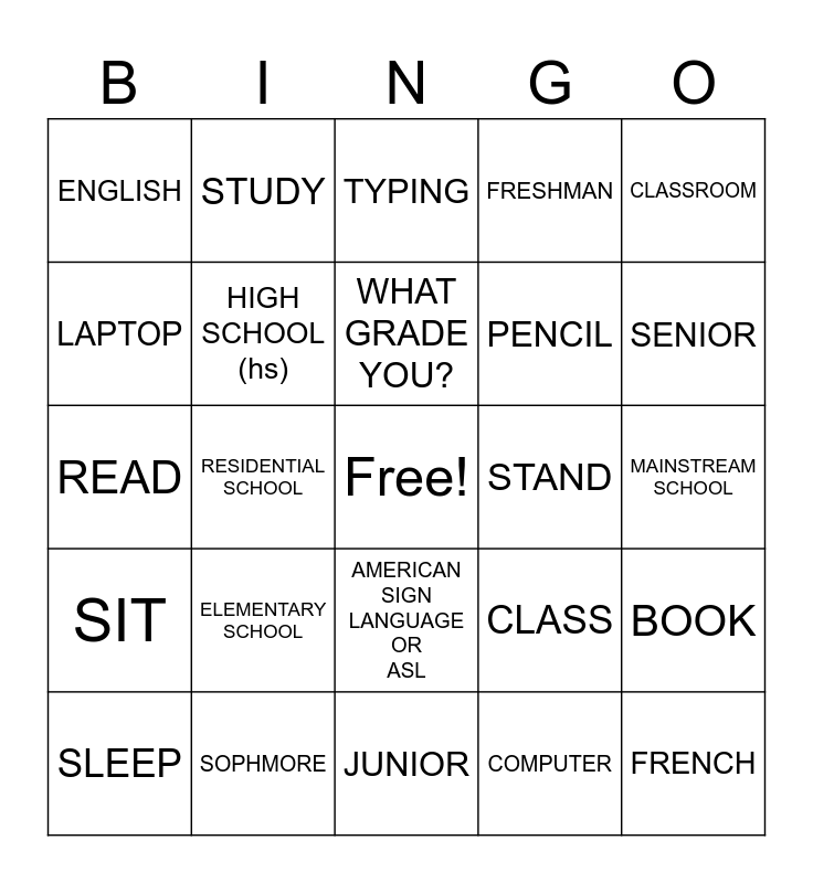 This bingo card has a free space and 28 words: BOOK, PAPER, PENCIL, COMPUTER, LAPTOP, TYPING, STUDY, SIT, STAND, SLEEP, READ, FRESHMAN, SOPHMORE, JUNIOR, SENIOR, MIDDLE SCHOOL, ELEMENTARY SCHOOL, HIGH SCHOOL (hs), WHAT GRADE YOU?, AMERICAN SIGN LANGUAGE OR ASL, ENGLISH, SPANISH, FRENCH, RESIDENTIAL SCHOOL, MAINSTREAM SCHOOL, CLASS, CLASSROOM and COMUTER LAB.