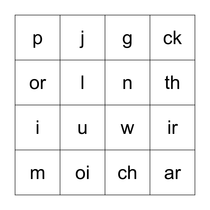This bingo card has 16 words: oi, ir, g, p, i, j, w, ch, or, l, m, ck, u, th, n and ar.