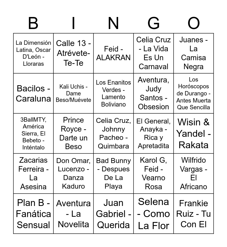 This bingo card has 75 words: Bad Bunny - EoO, Bad Bunny - NUEVAYoL, Feid - ALAKRAN, Bad Bunnny, JHAYCO - Tarot, Bad Bunny, Jowell&Randy, Ñengo flow - Safaera, Karol G, Cris MJ, Ryan Castro - Una noche en Medellín, Don Omar - Salió El Sol, El Alfa, Darell, Noriel - 4K, Juan Luis Guerra 4.40 - Como Yo, Maná - Mariposa Traicionera, Frankie Ruiz - Tu Con El, Bad Bunny - Chambea, Los Enanitos Verdes - Lamento Boliviano, Bacilos - Caraluna, Elvis Crespo - Suavamente, Prince Royce - Darte un Beso, Marc Anthony - Vivir Mi Vida, Celia Cruz, Johnny Pacheo - Quimbara, Daddy Yankee - Ella Me Levanto, Juanes - La Camisa Negra, Plan B - Guataba, 3BallMTY, América Sierra, El Bebeto - Inténtalo, Kali Uchis - Dame Beso/Muévete, Calle 13 - Atrévete-Te-Te, Celia Cruz - La Vida Es Un Carnaval, Kali Uchis - Telepatía, Shakira, Wyclef Jean - Hips Don't Lie, Rawayana, Monsieur Periné - Hora Loca, Bad Bunny, Bomba Estéreo - Ojitos Lindos, Jarabe De Palo - Jarabe De Palo, Don Omar - Pobre Diabla, Jenni Rivera - Parrandera (Rebelde y Atrevida), Héctor "El Father", Wisin & Yandel - El Teléfono, Karol G, Feid - Vearno Rosa, Los Horóscopos de Durango - Antes Muerta Que Sencilla, Aventura, Judy Santos - Obsesion, Karol G - Latina Forever, Ozuna - Dile Que Tu Me Quieres, Wisin & Yandel - Rakata, Selena - Como La Flor, Carlos Vives, Shakira - La Bicicleta, Karol G, Shakira - TQG, Karol G - Si Antes Te Hubiera Conocido, Marc Anthony - Tu Amor Me Hace Bien, Daddy Yankee - Gasolina, Daddy Yankee - Lo Que Pasó, Pasó, Plan B - Fanática Sensual, La Dimensión Latina, Oscar D'León - Lloraras, Maluma - El Perdedor, Frankie Ruiz - Mi Libertad, Rosalía - Bizcochito, Bad Bunny - Despues De La Playa, Manu Chao - Me Gustas Tu, El Alfa, El Cherry Scom, CJ - La Mamá de la Mamá, Los Tuscanes De Tijuana - La Chona, Los Ángeles Azules, N. Lafourcade - Nunca Es Suficiente, Joe Arroyo, La Verdad - Rebelión, Santana, Maná - Corazon Espinado, Grupo menos É Mais - Coração Partido, Grupo Frontera, Bad Bunny - un x100to, Don Omar, Lucenzo - Danza Kaduro, Bobby Pulido - Desvelado, Grupo Merenguisimo - El Biper, Soca Man - Pasame La Botella, El Roockie, De La Ghetto - Martes de Galería, El General, Anayka - Rica y Apretadita, Mägo de Oz - Molinos De Viento, Ñejo & Dalmata - Pasarela, Toño Rosario - Dale Vieja Dale, Wilfrido Vargas - El Africano, Zacarias Ferreira - La Asesina, Aventura - La Novelita, Rocío Dúrcal - Ya Te Olvidé, Juan Gabriel - Querida and Joaquín Sabina - Y Sin Embargo.