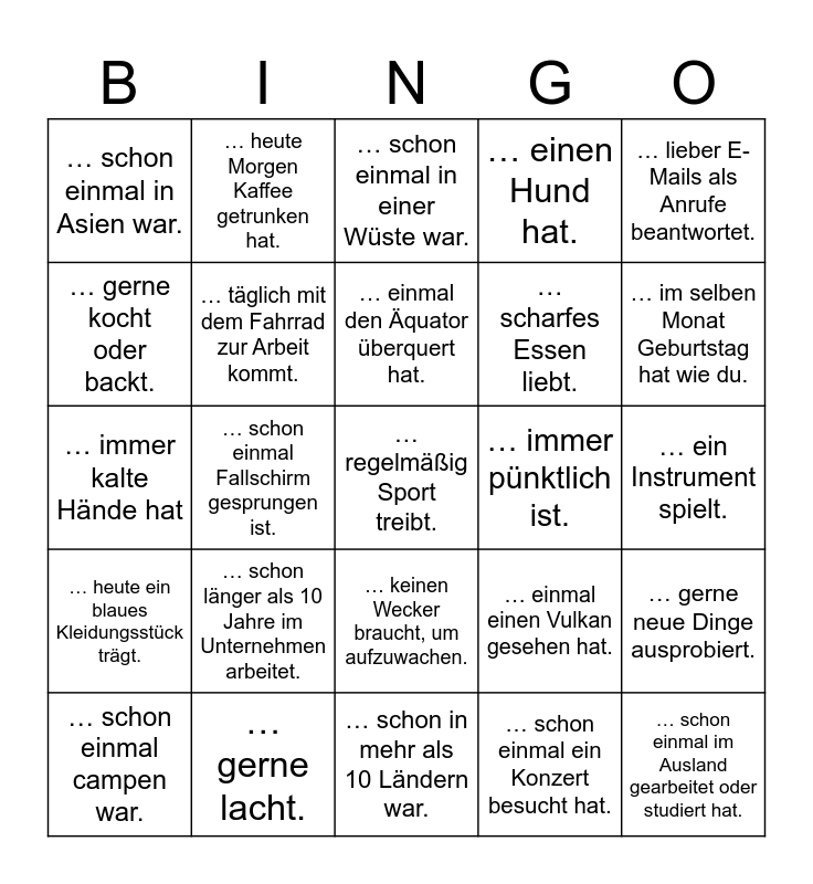 This bingo card has a free space and 24 words: … schon länger als 10 Jahre im Unternehmen arbeitet., … gerne lacht., … einmal den Äquator überquert hat., … schon einmal campen war., … lieber E-Mails als Anrufe beantwortet., … schon einmal in Asien war., … gerne kocht oder backt., … heute Morgen Kaffee getrunken hat., … immer pünktlich ist., … keinen Wecker braucht, um aufzuwachen., … scharfes Essen liebt., … immer kalte Hände hat, … einmal einen Vulkan gesehen hat., … gerne neue Dinge ausprobiert., … täglich mit dem Fahrrad zur Arbeit kommt., … schon einmal ein Konzert besucht hat., … ein Instrument spielt., … schon einmal in einer Wüste war., … im selben Monat Geburtstag hat wie du., … schon einmal Fallschirm gesprungen ist., … schon einmal im Ausland gearbeitet oder studiert hat., … heute ein blaues Kleidungsstück trägt., … einen Hund hat. and … schon in mehr als 10 Ländern war..