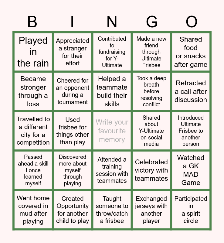 This bingo card has a free space and 24 words: Discovered more about myself through playing, Created Opportunity for another child to play, Helped a teammate build their skills, Went home covered in mud after playing, Shared food or snacks after game, Played in the rain, Became stronger through a loss, Appreciated a stranger for their effort, Shared about Y-Ultimate on social media, Attended a training session with teammates, Took a deep breath before resolving conflict, Travelled to a different city for a competition, Celebrated victory with teammates, Watched a GK MAD Game, Cheered for an opponent during a tournament, Exchanged jerseys with another player, Introduced Ultimate Frisbee to another person, Contributed to fundraising for Y-Ultimate, Retracted a call after discussion, Used frisbee for things other than play, Participated in a spirit circle, Passed ahead a skill I once learned myself, Made a new friend through Ultimate Frisbee and Taught someone to throw/catch a frisbee.