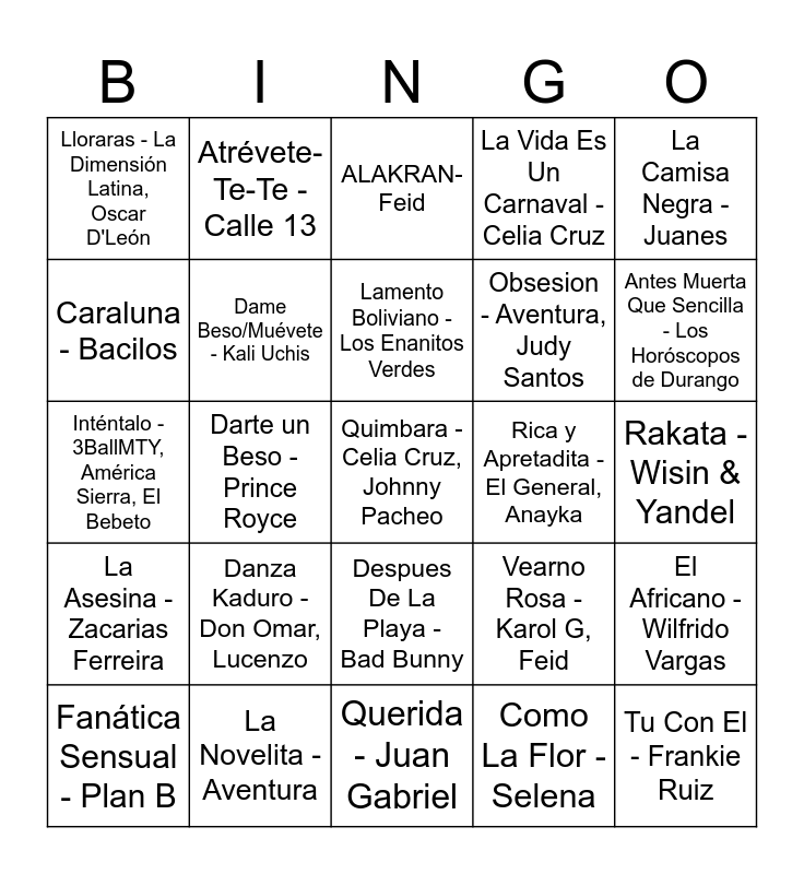 This bingo card has 75 words: EoO - Bad Bunny, NUEVAYoL- Bad Bunny, ALAKRAN- Feid, Tarot - Bad Bunnny, JHAYCO, Safaera - Bad Bunny, Jowell&Randy, Ñengo flow, Una noche en Medellín - Karol G, Cris MJ, Ryan Castro, Salió El Sol - Don Omar, 4K - El Alfa, Darell, Noriel, Como Yo - Juan Luis Guerra 4.40, Mariposa Traicionera - Maná, Tu Con El - Frankie Ruiz, Chambea - Bad Bunny, Lamento Boliviano - Los Enanitos Verdes, Caraluna - Bacilos, Suavamente - Elvis Crespo, Darte un Beso - Prince Royce, Vivir Mi Vida - Marc Anthony, Quimbara - Celia Cruz, Johnny Pacheo, Ella Me Levanto - Daddy Yankee, La Camisa Negra - Juanes, Guataba - Plan B, Inténtalo - 3BallMTY, América Sierra, El Bebeto, Dame Beso/Muévete - Kali Uchis, Atrévete-Te-Te - Calle 13, La Vida Es Un Carnaval - Celia Cruz, Telepatía - Kali Uchis, Hips Don't Lie - Shakira, Wyclef Jean, Hora Loca - Rawayana, Monsieur Periné, Ojitos Lindos - Bad Bunny, Bomba Estéreo, La flaca - Jarabe De Palo, Pobre Diabla - Don Omar, Parrandera (Rebelde y Atrevida) - Jenni Rivera, El Teléfono - Héctor "El Father", Wisin & Yandel, Vearno Rosa - Karol G, Feid, Antes Muerta Que Sencilla - Los Horóscopos de Durango, Obsesion - Aventura, Judy Santos, Latina Forever - Karol G, Dile Que Tu Me Quieres - Ozuna, Rakata - Wisin & Yandel, Como La Flor - Selena, La Bicicleta - Carlos Vives, Shakira, TQG - Karol G, Shakira, Si Antes Te Hubiera Conocido - Karol G, Tu Amor Me Hace Bien - Marc Anthony, Gasolina - Daddy Yankee, Lo Que Pasó, Pasó - Daddy Yankee, Fanática Sensual - Plan B, Lloraras - La Dimensión Latina, Oscar D'León, El Perdedor - Maluma, Mi Libertad - Frankie Ruiz, Bizcochito - Rosalía, Despues De La Playa - Bad Bunny, Me Gustas Tu - Manu Chao, La Mamá de la Mamá - El Alfa, El Cherry Scom, CJ, La Chona - Los Tuscanes De Tijuana, Nunca Es Suficiente - Los Ángeles Azules, N. Lafourcade, Rebelión - Joe Arroyo, La Verdad, Corazon Espinado - Santana, Maná, Coração Partido - Grupo menos É Mais, Un x100to - Grupo Frontera, Bad Bunny, Danza Kaduro - Don Omar, Lucenzo, Desvelado - Bobby Pulido, El Biper - Grupo Merenguisimo, Pasame La Botella - Soca Man, Martes de Galería - El Roockie, De La Ghetto, Rica y Apretadita - El General, Anayka, Molinos De Viento - Mägo de Oz, Pasarela - Ñejo & Dalmata, Dale Vieja Dale - Toño Rosario, El Africano - Wilfrido Vargas, La Asesina - Zacarias Ferreira, La Novelita - Aventura, Ya Te Olvidé - Rocío Dúrcal, Querida - Juan Gabriel and Y Sin Embargo - Joaquín Sabina.