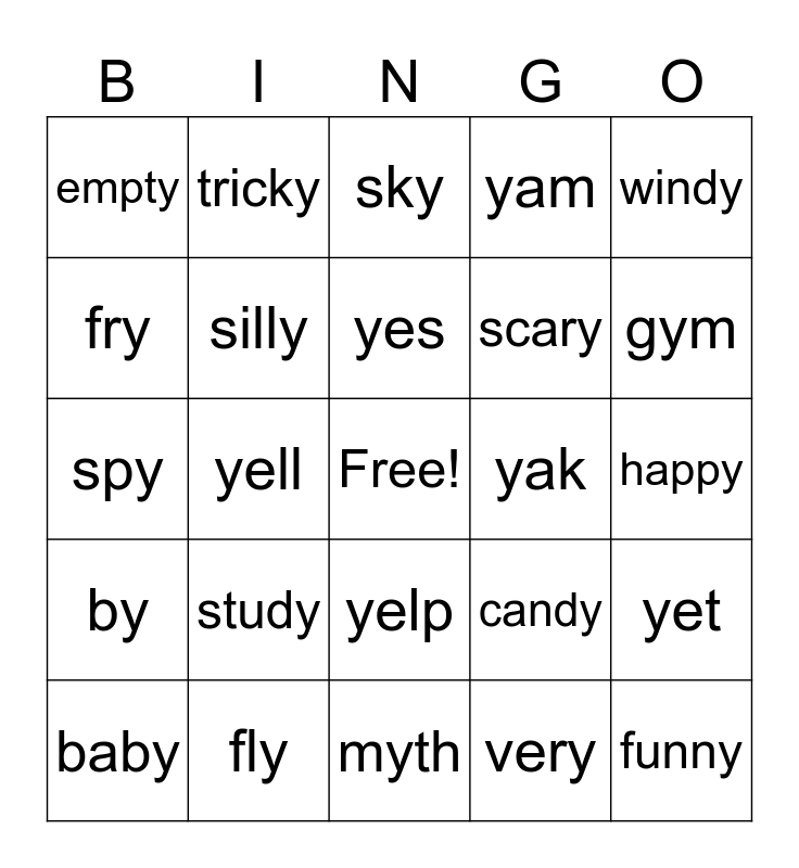 This bingo card has a free space and 29 words: baby, city, yell, yellow, empty, sky, silly, study, yak, fly, happy, funny, myth, very, gym, my, yelp, by, windy, spy, candy, yes, scary, fry, yam, tricky, yet, yes and shy.